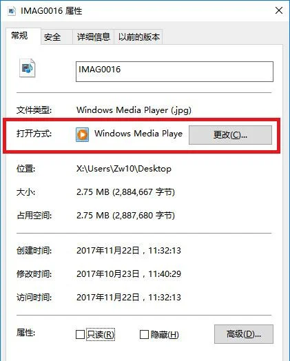 6、在打开的属性对话框里,我们选中打开方式后面的《更改》选项,然后选择我们想要使用的应用程序。