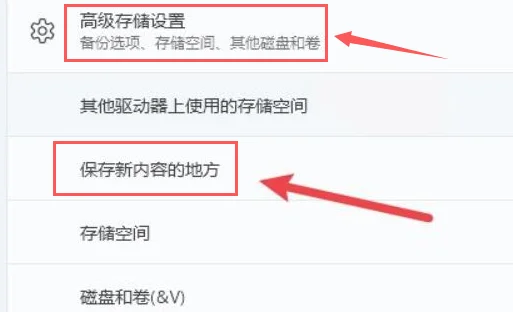 2、在高级存储设置选项中,打开保存新内容地方栏目。