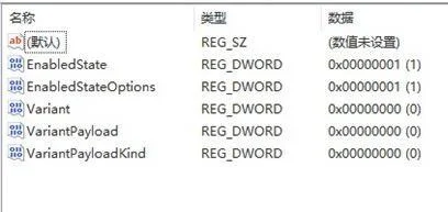 5、接着在右侧新建5个“DWORD值”分别命名为“EnabledState”“EnabledStateOptions”“Variant”“VariantPayload”“VariantPayloadKind”