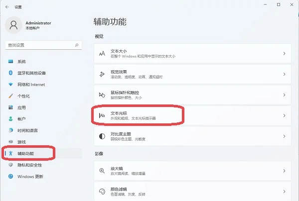 2、在左边点击【辅助功能】,右边选择【文本光标】。
