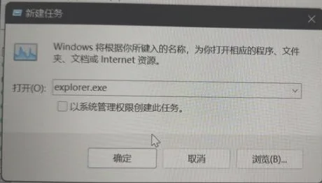4、在新建任务中输入“explorer.exe”勾选下方管理权限,再点击“确定”即可。