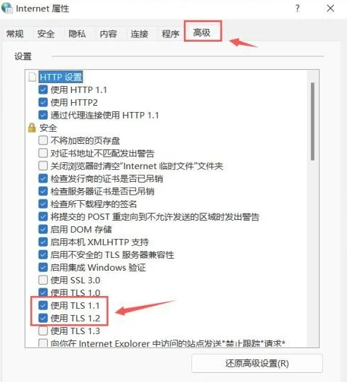4、选择左下角“Internet选项”-“高级”-将“使用TLS1.1”和“使用TLS1.2”勾选-确定,然后小组件就可以使用。