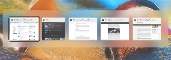 就如截图所示,在新版Win11当中,多任务界面改回了类似Win10的窗口模式。现在,“Alt+Tab”的体验在桌面上看起来更好,窗口周围还具有模糊效果。