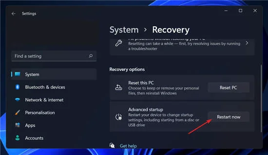 2、现在单击 Advanced Startup 旁边的Restart Now按钮。