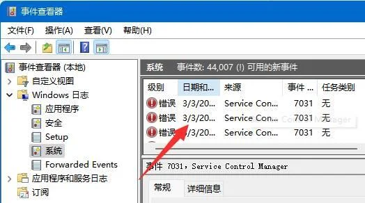 4、然后进入“windows日志”,查看是哪里的错误导致的蓝屏。