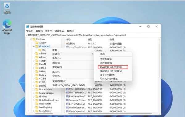 4、鼠标右键在这里新建一个【TaskbarSi】的DWORD值(32)。