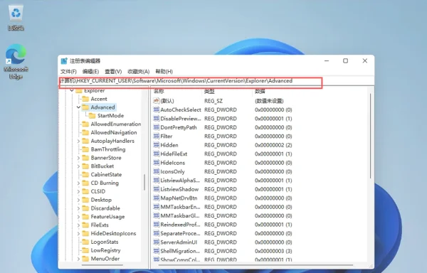 3、进入注册表后,在地址栏中输入:HKEY_CURRENT_USER\Software\Microsoft\ Windows\CurrentVersion\Explorer\Advanced\