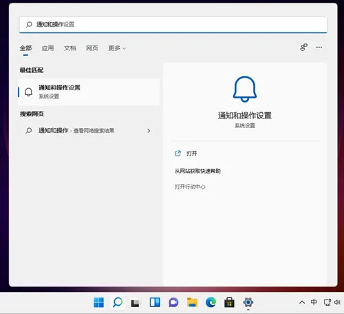1、首先直接在界面下方的搜索框中搜索“通知和操作”,搜索结果中打开“通知和操作设置”。