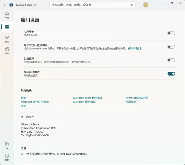 新版应用商店更新后,左上角显示有“预览”字样,证明这并不是最终发行版本。截至发稿,这一应用的版本号为 22107.1401.4.0。