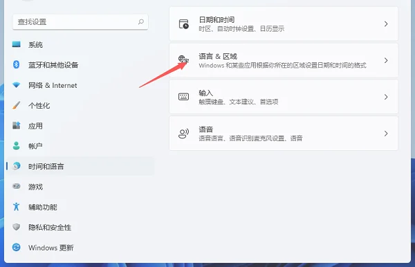 2、在打开的Windows设置窗口中,点击【时间和语言】。然后点击右侧边栏的【语言和区域】菜单项。